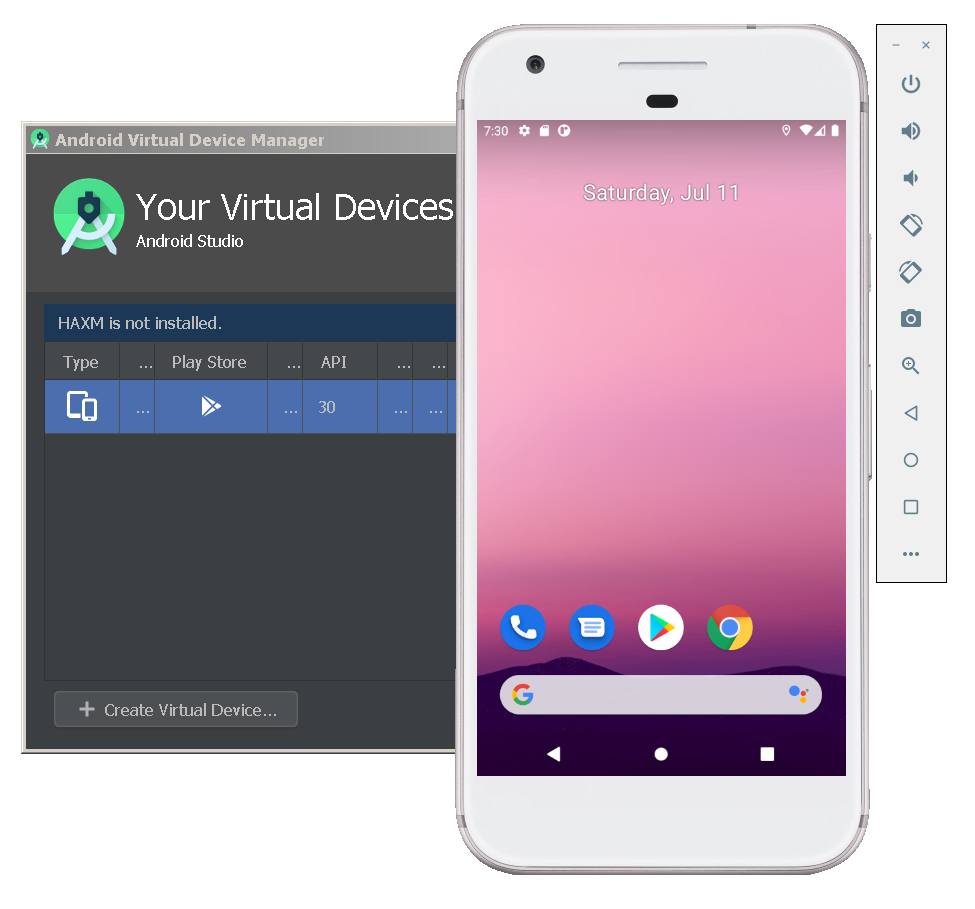 AVD Manager를 이용하여 가상장치(AVD, 안드로이드 폰이나 태블릿 등 장치)를 실행할 수 있다.