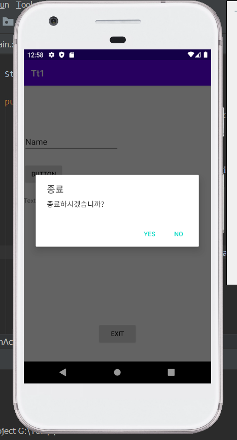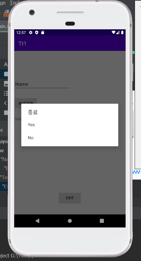 함수 추가 방법을 모른다면 기존 Project참고: AndroidStudio - 단순 계산기 앱(Apk) 만들기public void exitbtnClick(View v) { AlertDialog.Builder bd1 = new AlertDialog.Builder(MainActivity.this); bd1.setTitle("종료"); bd1.setMessage("종료하시겠습니까?"); bd1.setCancelable(false); bd1.setNegativeButton("Yes", new DialogInterface.OnClickListener() { @Override public void onClick(DialogInterface dialogInterface, int i) { finish(); } }); bd1.setPositiveButton("No", new DialogInterface.OnClickListener() { @Override public void onClick(DialogInterface dialogInterface, int i) { dialogInterface.cancel(); } }); AlertDialog.Builder bd2 = new AlertDialog.Builder(MainActivity.this); bd2.setTitle("종료"); final String[] items = {"Yes", "No"}; bd2.setItems(items, new DialogInterface.OnClickListener() { @Override public void onClick(DialogInterface dialogInterface, int i) { Toast.makeText(getApplicationContext(), items[i], Toast.LENGTH_SHORT).show(); switch (items[i]) { case "Yes": finish(); break; case "No": dialogInterface.cancel(); break; } } }); AlertDialog a = bd1.create(); //AlertDialog a = bd2.create(); a.show(); }위 소스코드는 아래 Project첨부파일을 다운로드해서도 확인 가능하다.