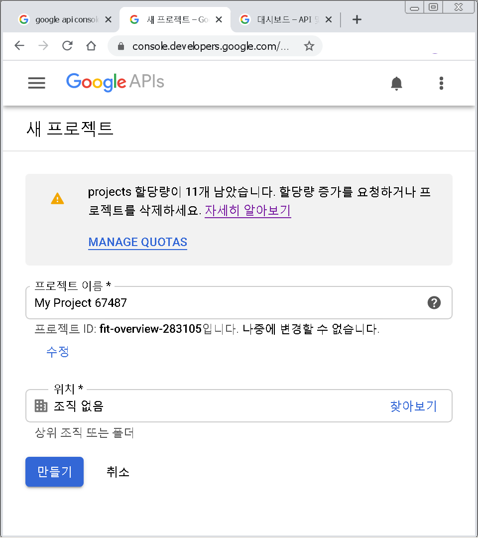 아래 google 개발자 패이지에 들어가서 생성해야 한다.