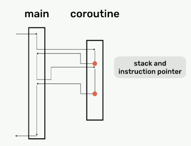일반 함수에서 coroutine은 suspend(or yield)/resume가 추가 된 함수처럼 생각할 수 있다. 함수 호출하면 한번에 끝까지 가지 않고 지정된 yield코드 위치에서 멈추고 위치를 기억해두고 호출 한 곳으로 되돌아간다. 다음 호출에서는 멈춘 위치에서 시작한다.