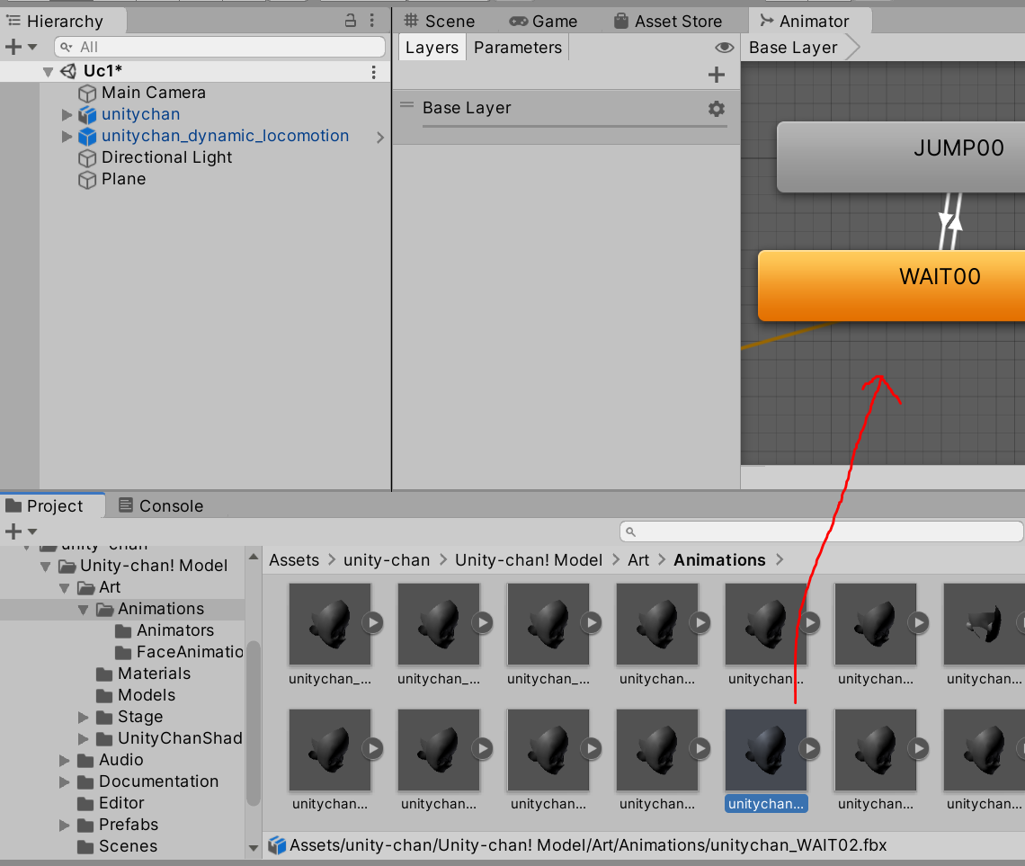unity-chan\Unity-chan! Model\Art\Animations\unitychan_WAIT00.fbx을 끌어다 놓는다