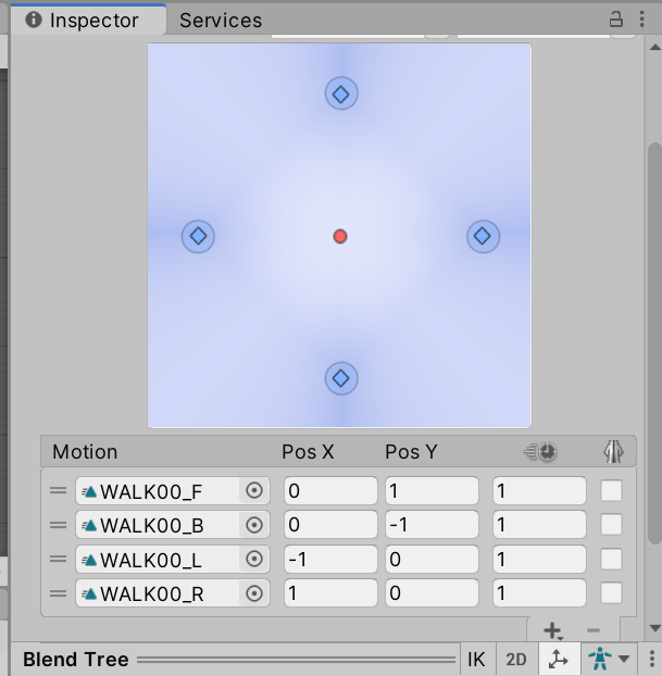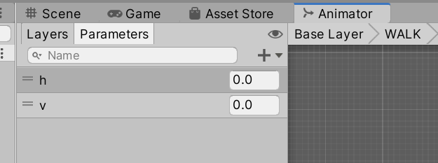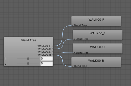mH = Input.GetAxis("Horizontal"); mV = Input.GetAxis("Vertical"); mAnim.SetFloat("h", mH); mAnim.SetFloat("v", mV);BlendTree생성 후