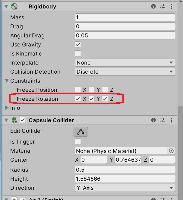 캐릭터에 Component를 추가하고 나서 움직여보면 캐릭터가 공처럼 굴러가는 문제가 있다. 충돌체크가 캡슐 형태로 되기에 지면에 캡슐이 굴러가는 현상이 일어난다. FreezeRotation을 해주면 해결 가능하다.