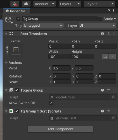 빈 GameObject를 만들고 ToggleGroup Component를 추가해 사용할 수 있다.