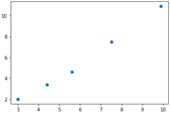 import matplotlib.pyplot as plt x = [3, 4.4, 5.6, 7.5, 9.9] y = [2, 3.4, 4.6, 7.5, 10.9] plt.scatter(x,y, label="testt")