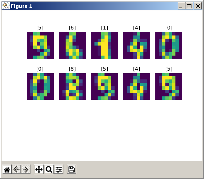from sklearn import datasets, svm, metrics, neighbors, model_selection, metrics import joblib import matplotlib.pyplot as plt import random clf = joblib.load('digits.pkl') digits = datasets.load_digits() for i in range(10): plt.subplot(3,5, i+1) plt.axis("off") n = random.randrange(0, 10) plt.title(str(clf.predict(digits.images[n].reshape(-1,64)))) plt.imshow(digits.images[n]) plt.show()