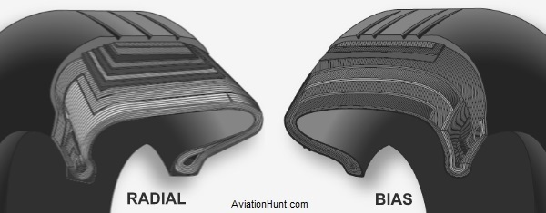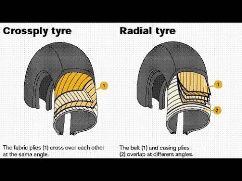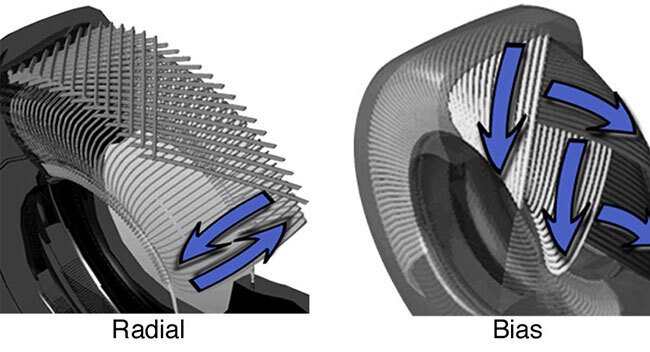 바퀴 회전 방향 및 타이어 측벽 90°에 견고하게 겹의 직물 섬유 가닥을 사용한다. 이로인해 양방향으로 유연성과 측벽의 유연성을 제한하는 반면 타이어는 무거운 하중을 견딜 수 있도록 강화된다.