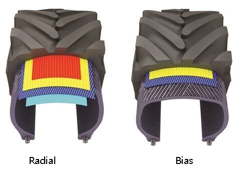 회전 측벽 방향으로 가로 질러 배향 된 직물 바이어스를 사용한다. 직물이 바이어스로 인해 늘어날 수 있기 때문에 타이어는 유연하고 하중을 흡수할 수 있다. 타이어 강도는 플라이를 추가하여 향상 시킬 수 있다.