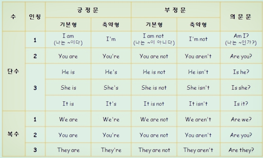 am, are, is; are = 모든복수형과 2인칭, 그 외 am = 1인칭, are = 2인칭, is = 3인칭.