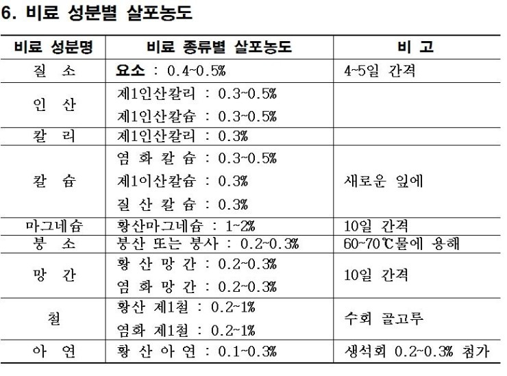 7~10일 간격 시비, 총 2~4회 정도가 좋다.농도