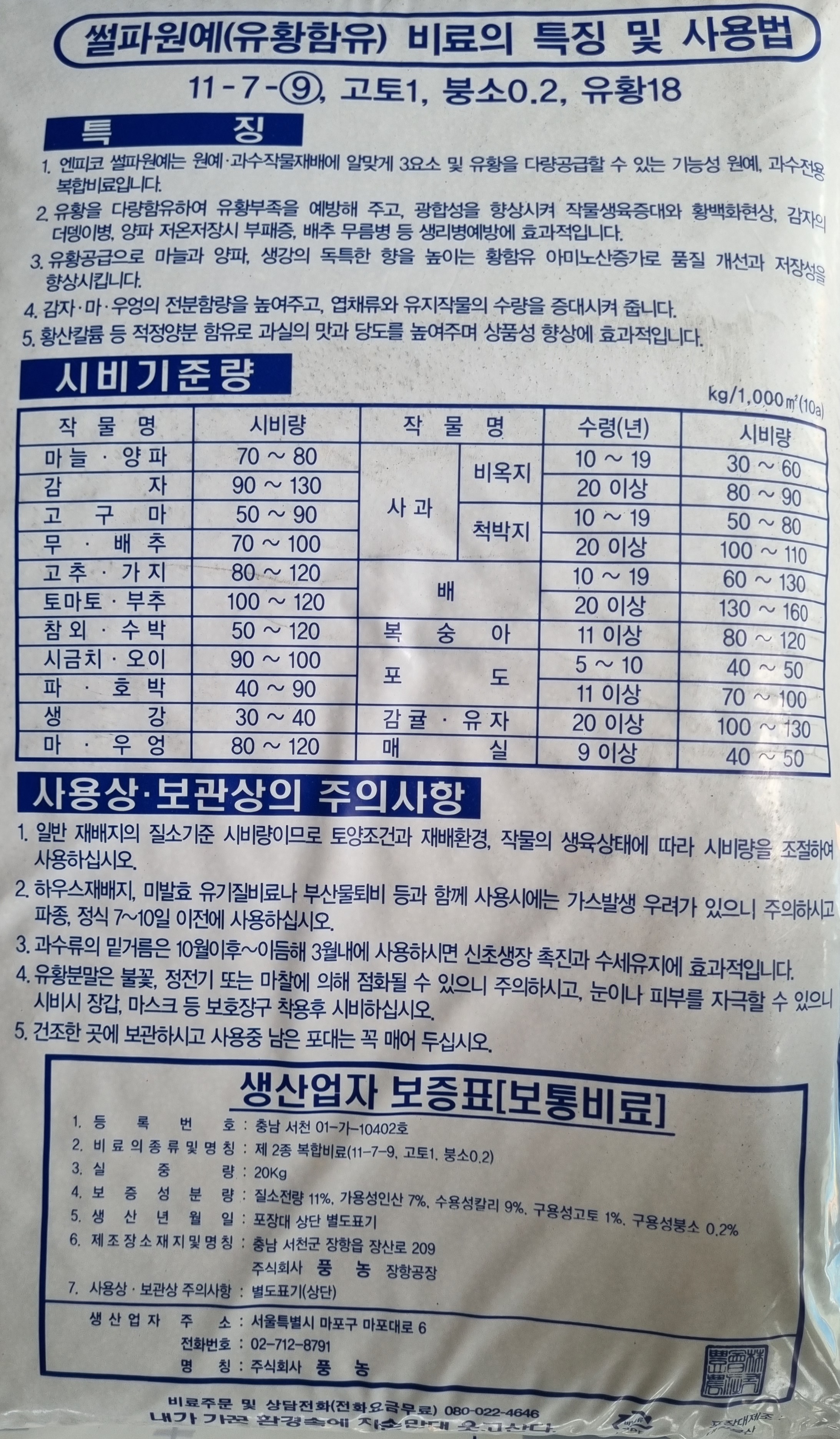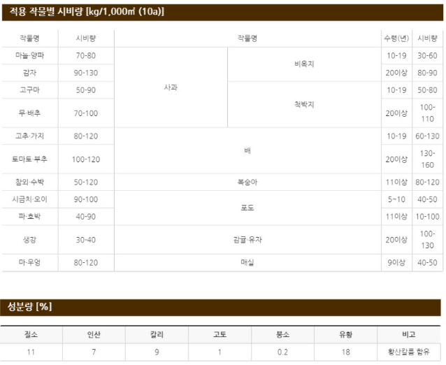 N2.2kg 가용성인산1.4kg 수용성칼리1.8kg 구용성고토0.2kg 구용성붕소0.04kg 유황3.6kg