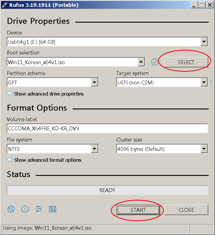 'SELECT'를 눌러 Windows ISO를 선택하고 대상USB가 맞는지 확인 후 'START'를 누르면 시작된다