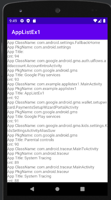 var pkgmgr: PackageManager = this.packageManager; var intent: Intent = Intent(Intent.ACTION_MAIN, null); //intent.addCategory(Intent.CATEGORY_LAUNCHER); var apps: List<ResolveInfo> = pkgmgr.queryIntentActivities(intent, 0); var cnt = 0 for (ri in apps) { cnt++ var ai = ri.activityInfo; qv("cnt: " + cnt) qv("App Title: " + ai.loadLabel(pkgmgr).toString()); qv("App PkgName: " + ai.packageName); qv("App ClassName: " + ai.name); var resid = ai.applicationInfo.icon; }