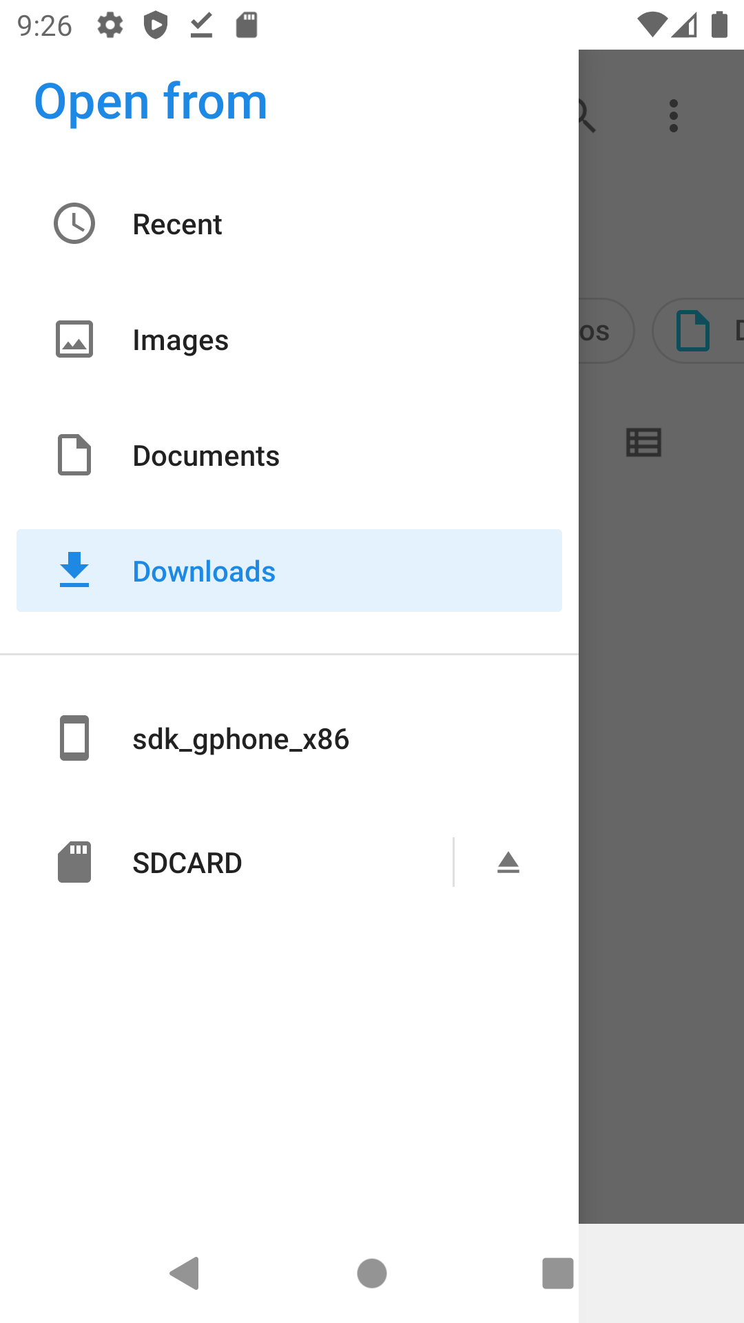 int MyReqCode = 122333; //... Intent intent = new Intent().setType("*/*") .setAction(Intent.ACTION_OPEN_DOCUMENT); intent.addCategory(Intent.CATEGORY_OPENABLE); startActivityForResult(Intent.createChooser(intent, "Select a file"), MyReqCode);@Override protected void onActivityResult(int requestCode, int resultCode, Intent data) { super.onActivityResult(requestCode, resultCode, data); if(requestCode == MyReqCode && resultCode == RESULT_OK) { Uri selfile = data.getData(); Toast.makeText(getApplicationContext(), getFilenameFromUri(selfile), Toast.LENGTH_LONG).show(); } } private String getFilenameFromUri(Uri uri) { String fn = ""; //선택된 경로 정보: uri.getPath() if(uri.getScheme().equals("contents")) { Cursor cursor = getContentResolver().query(uri, null, null, null, null); try { if (cursor != null && cursor.moveToFirst()) { fn = cursor.getString(cursor.getColumnIndex(OpenableColumns.DISPLAY_NAME)); } } finally { cursor.close(); } } if (fn == null) { fn = uri.getPath(); int cut = fn.lastIndexOf('/'); if (cut != -1) { fn = fn.substring(cut + 1); } } return fn; }