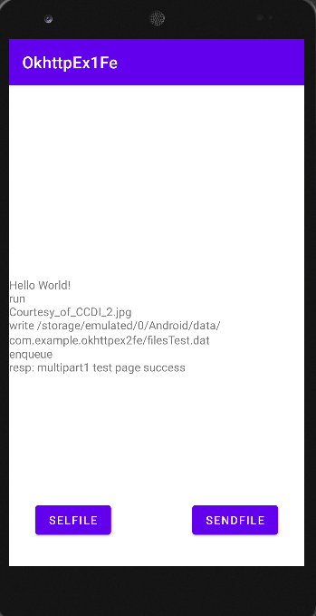 Intent data = new Intent(Intent.ACTION_OPEN_DOCUMENT); data.addCategory(Intent.CATEGORY_OPENABLE); String[] mimeTypes = {"*/*"}; data.putExtra(Intent.EXTRA_MIME_TYPES, mimeTypes); data = Intent.createChooser(data, "파일 선택");mAtvRstObj = registerForActivityResult(new ActivityResultContracts.StartActivityForResult(), new ActivityResultCallback<ActivityResult>() { @Override public void onActivityResult(ActivityResult result) { if (result.getResultCode() == Activity.RESULT_OK) { Intent data = result.getData(); mUri = data.getData(); //MainActivity.this.mUri; String fn = getFileNameFromUri(mUri); Toast.makeText(getApplicationContext(), fn, Toast.LENGTH_LONG).show(); //check selected file if (mAtvRstObj.toString() != null) { qv(fn); } } } });InputStream is = getContentResolver().openInputStream(mUri); sendfn = getApplicationContext().getExternalFilesDir("")+"Test.dat";RequestBody reqMpBody = new MultipartBody.Builder() .setType(MultipartBody.FORM) .addFormDataPart("title", "STORE Camera") .addFormDataPart("file1","file1_stream.jpg", RequestBody.create(MultipartBody.FORM, file1)) .build();