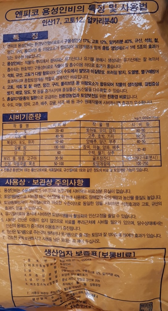 '풍농 용성인비' 알카리40%, 구용성P20%, 고토12%, 규산,석회,
