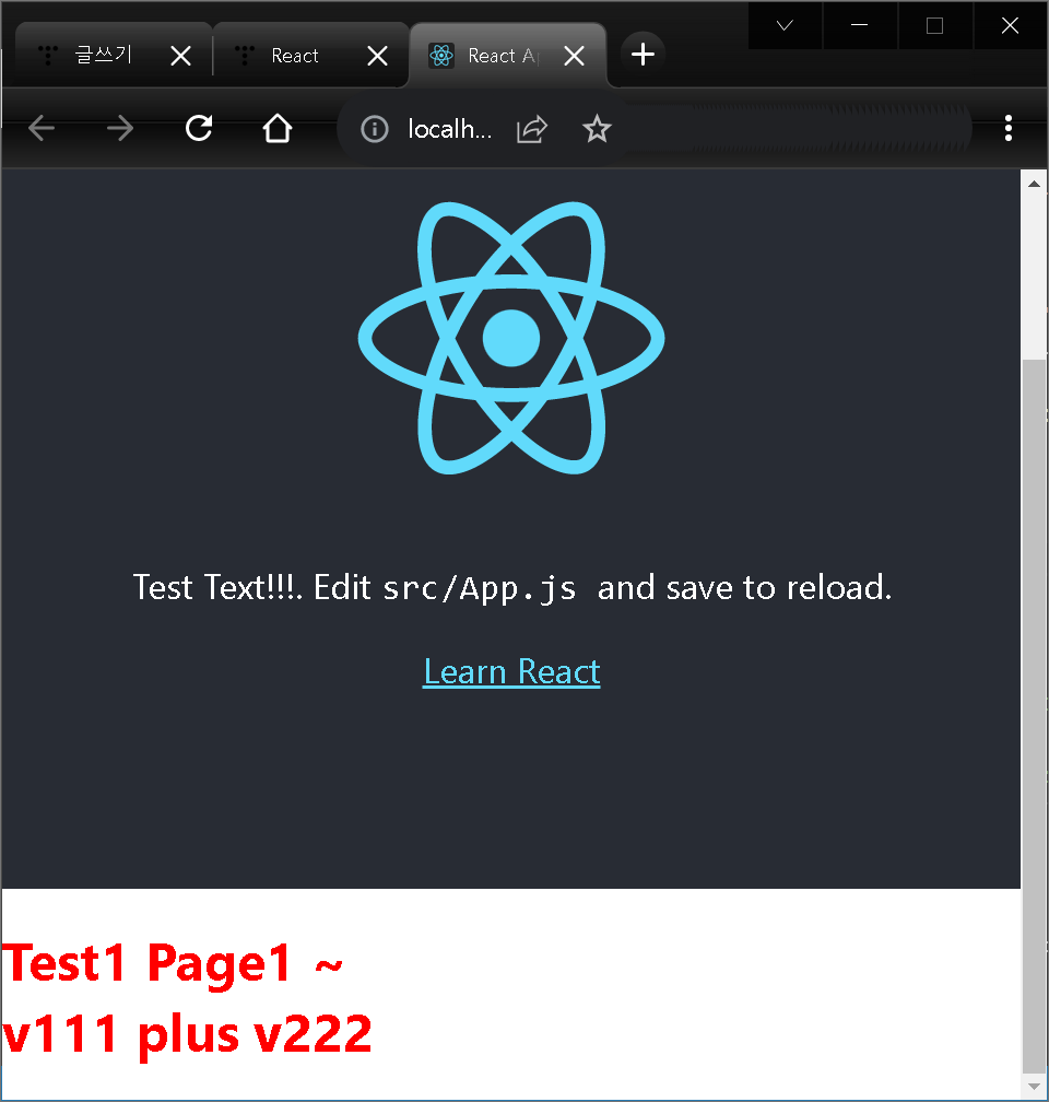 ... import Test1 from './Test1.js'; const root = ReactDOM.createRoot(document.getElementById('root')); root.render( <React.StrictMode> <App /> <Test1 /> </React.StrictMode> );기존 App뒤에 Test1을 추가했다.