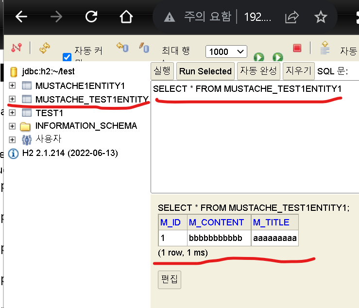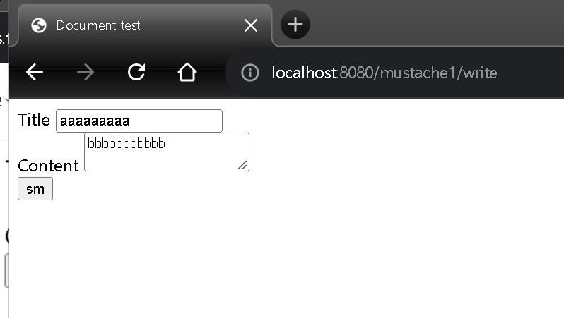 <form action="/mustache1/create" method="post"> <div> <label class="form-label">Title</label> <input type="text" name="title"> </div> <div> <label class="form-label">Content</label> <textarea name="content"></textarea> </div> <button type="submit">sm</button> </form>실행결과