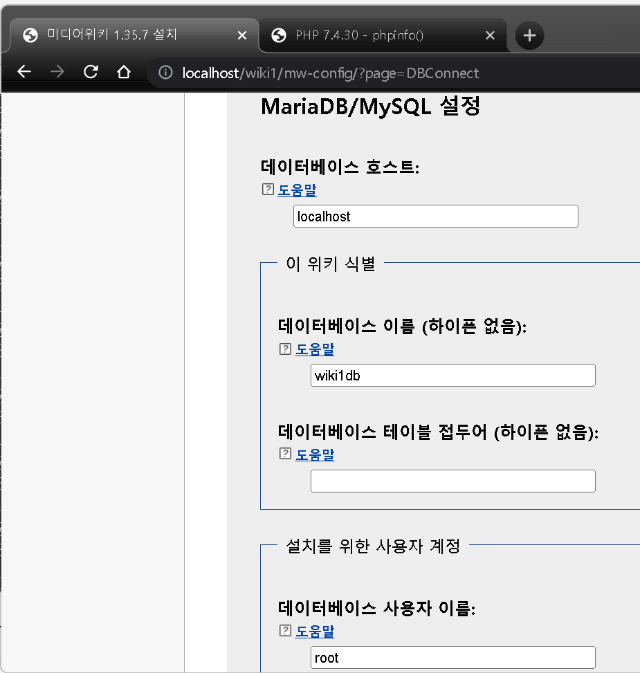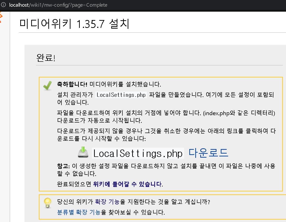 http://localhost/wiki1/mw-config/에 접속하면 초기 설정을 하라고 한다.