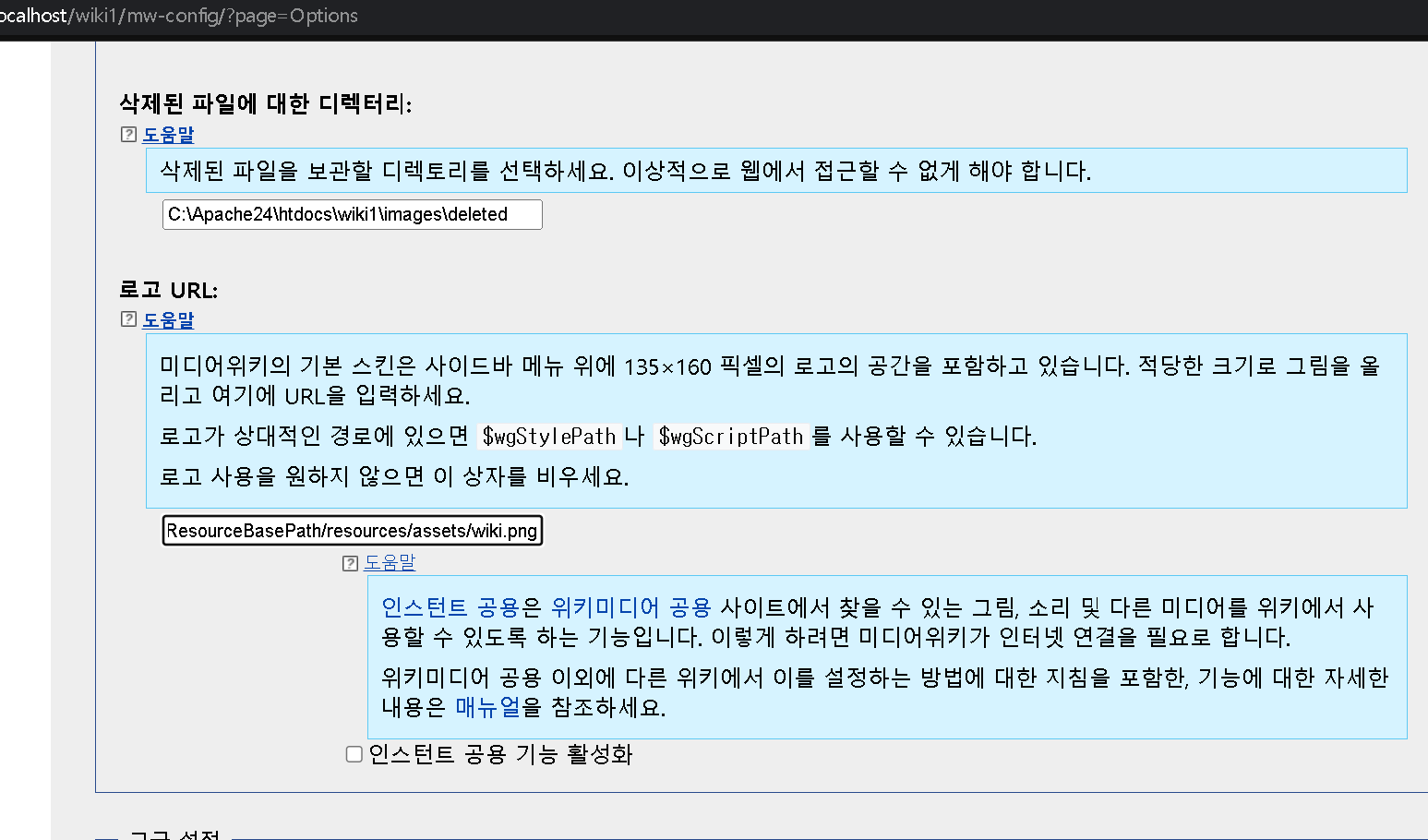 안전하지 않은 저장을 허용하여 예외 제거하기(LocalSettings.php)