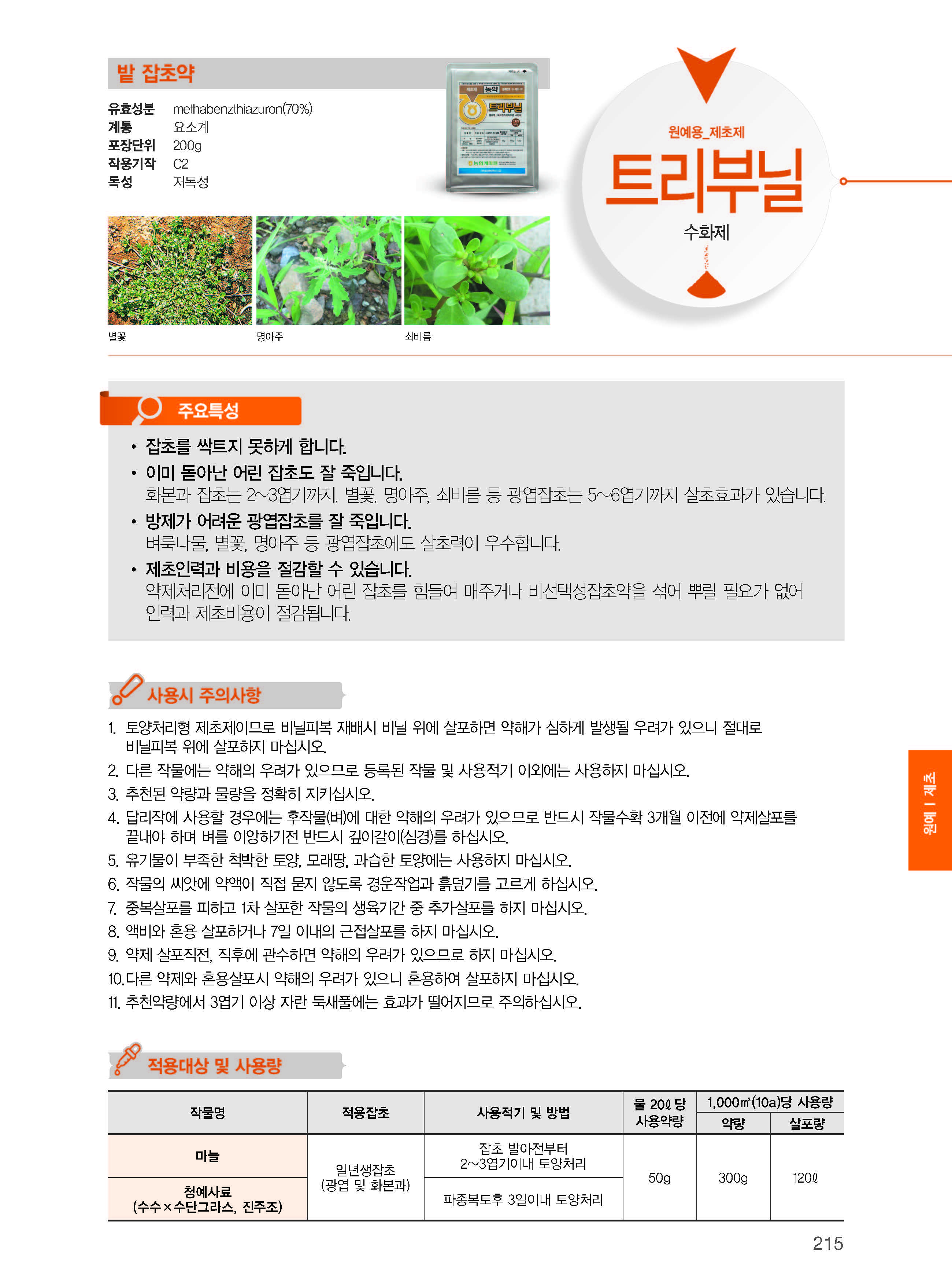 - 화본과 잡초는 2~3엽기까지, 별꽃, 명아주, 쇠비름 등 광엽잡초는 5~6엽기까지