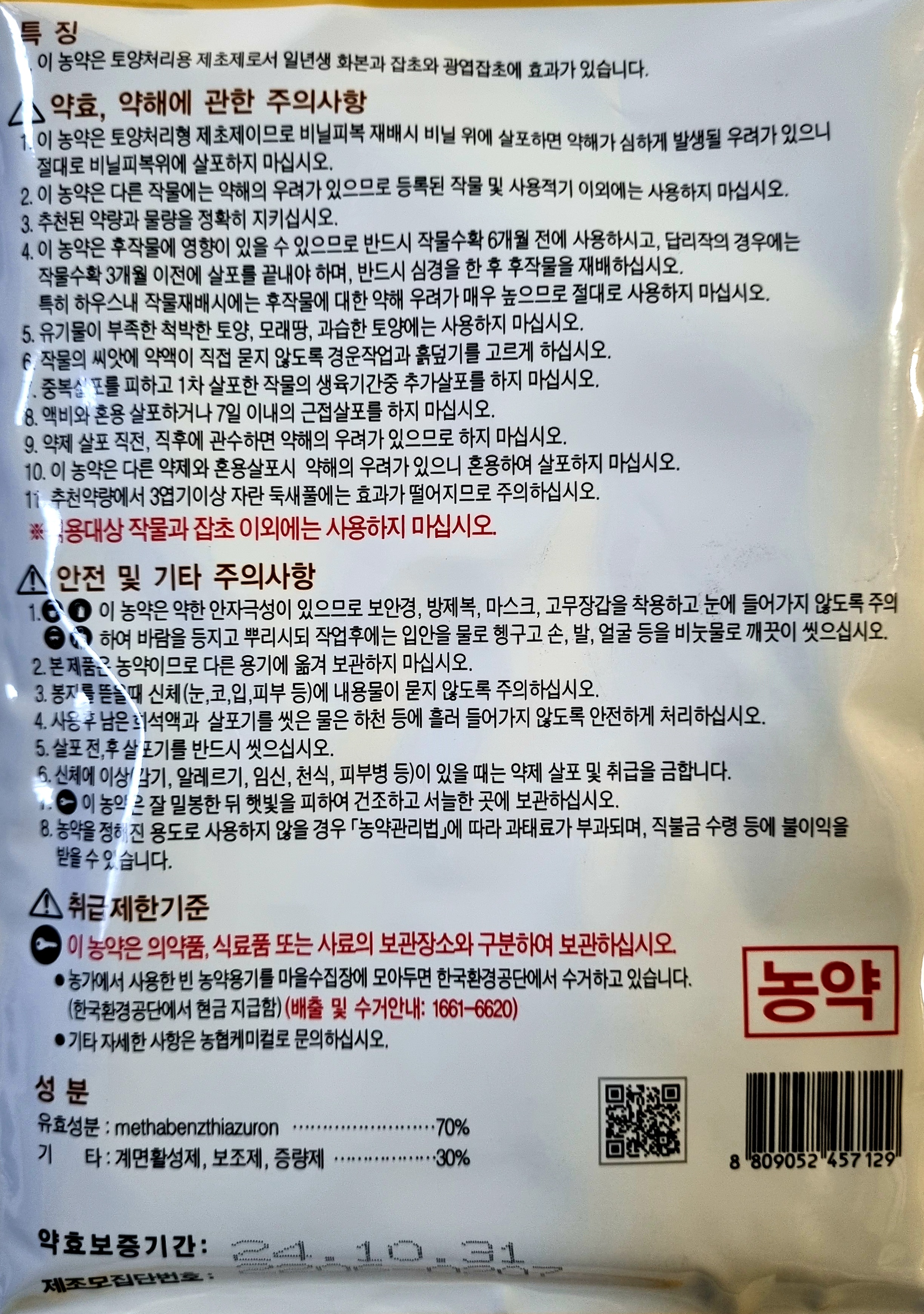 이 농약은 다른 작물에는 약해의 우려가 있으므로 등록된 작물 및 사용적기