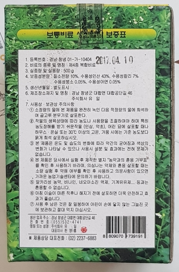 슈퍼스타K https://infos.tistory.com/4772;질소전량10, 수용성인산43, 수용성칼리7, 수용성붕소0.05, 수용성아연0.05