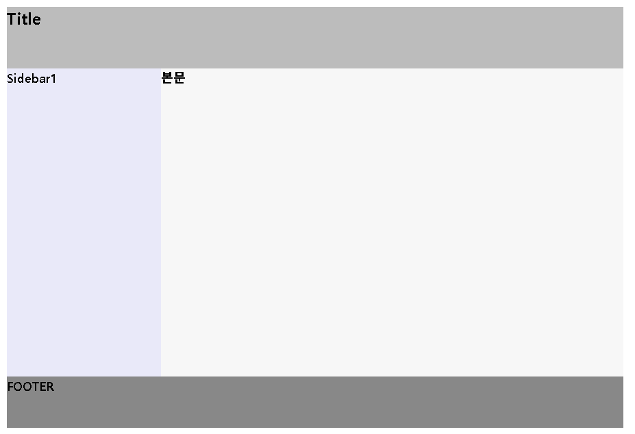 * { margin:0; padding:0; box-sizing: border-box; /* 테두리까지 포함해서 박스 모델 너비로 계산 */ } #container1 { /* 내용 전체의 값 */ width:800px; margin:20px auto; /* 내용을 화면 가운데 배치하도록 좌우 마진을 auto로 */ } #header1 { width:100%; height:120px; background-color:#bcbcbc; } #sidebar1 { width:200px; height:600px; background-color:#e9e9f9; float:left; } #contents1 { width:600px; height:600px; background-color:#f7f7f7; float:left; } #footer1 { width:100%; height:100px; background-color:#888888; clear:left; }<head> <link rel="stylesheet" href="layout1.css"> </head> <body> <div id="container1"> <header id="header1"> <h1>Title</h1> </header> <aside id="sidebar1"> <h2>Sidebar1</h2> </aside> <section id="contents1"> <h2>본문</h2> </section> <footer id="footer1"> <h2>FOOTER</h2> <footer> </div> </body>Title