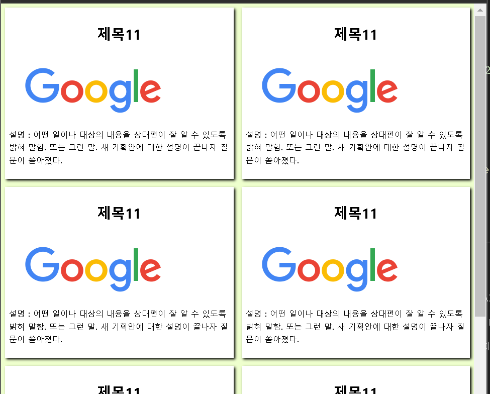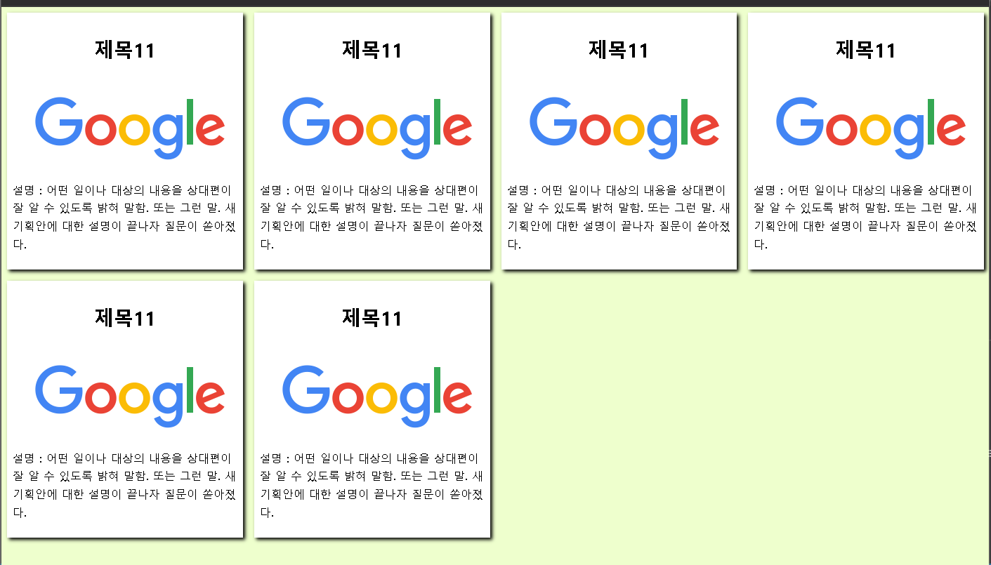 <!DOCTYPE html> <html lang="ko"> <head> <meta charset="UTF-8"> <meta name="viewport" content="width=device-width, initial-scale=1"> <title>GridTemplate예제</title> <link rel="stylesheet" href="cssgridtemplate1.css"> </head> <body> <div id="gridtemplateid1"> <div class="gridclass1"> <header> <h3>제목11</h3> </header> <figure> <img src="https://www.google.com/images/branding/googlelogo/1x/googlelogo_color_272x92dp.png"> </figure> <p>설명 : 어떤 일이나 대상의 내용을 상대편이 잘 알 수 있도록 밝혀 말함. 또는 그런 말. 새 기획안에 대한 설명이 끝나자 질문이 쏟아졌다.</p> </div> <div class="gridclass1"> <header> <h3>제목11</h3> </header> <figure> <img src="https://www.google.com/images/branding/googlelogo/1x/googlelogo_color_272x92dp.png"> </figure> <p>설명 : 어떤 일이나 대상의 내용을 상대편이 잘 알 수 있도록 밝혀 말함. 또는 그런 말. 새 기획안에 대한 설명이 끝나자 질문이 쏟아졌다.</p> </div> <div class="gridclass1"> <header> <h3>제목11</h3> </header> <figure> <img src="https://www.google.com/images/branding/googlelogo/1x/googlelogo_color_272x92dp.png"> </figure> <p>설명 : 어떤 일이나 대상의 내용을 상대편이 잘 알 수 있도록 밝혀 말함. 또는 그런 말. 새 기획안에 대한 설명이 끝나자 질문이 쏟아졌다.</p> </div> <div class="gridclass1"> <header> <h3>제목11</h3> </header> <figure> <img src="https://www.google.com/images/branding/googlelogo/1x/googlelogo_color_272x92dp.png"> </figure> <p>설명 : 어떤 일이나 대상의 내용을 상대편이 잘 알 수 있도록 밝혀 말함. 또는 그런 말. 새 기획안에 대한 설명이 끝나자 질문이 쏟아졌다.</p> </div> <div class="gridclass1"> <header> <h3>제목11</h3> </header> <figure> <img src="https://www.google.com/images/branding/googlelogo/1x/googlelogo_color_272x92dp.png"> </figure> <p>설명 : 어떤 일이나 대상의 내용을 상대편이 잘 알 수 있도록 밝혀 말함. 또는 그런 말. 새 기획안에 대한 설명이 끝나자 질문이 쏟아졌다.</p> </div> <div class="gridclass1"> <header> <h3>제목11</h3> </header> <figure> <img src="https://www.google.com/images/branding/googlelogo/1x/googlelogo_color_272x92dp.png"> </figure> <p>설명 : 어떤 일이나 대상의 내용을 상대편이 잘 알 수 있도록 밝혀 말함. 또는 그런 말. 새 기획안에 대한 설명이 끝나자 질문이 쏟아졌다.</p> </div> </div> </body> </html>실행화면