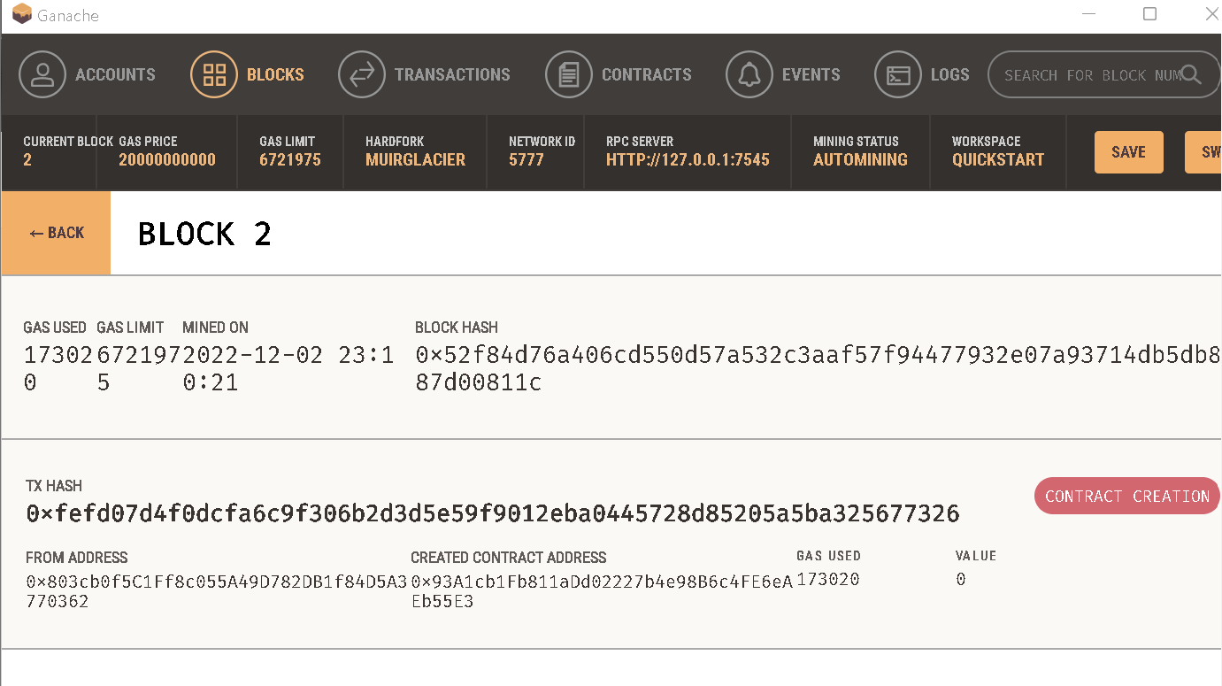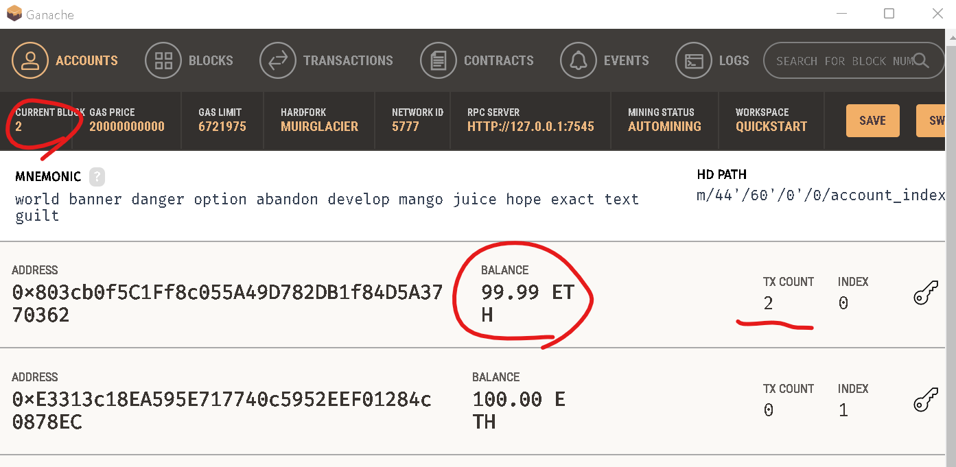 위 항목에 주석처리를 제거하고 Ganache에 나오는 값으로 입력한다.