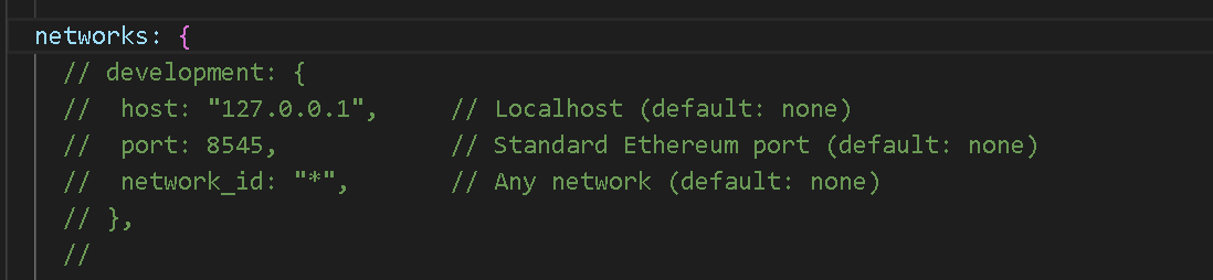 development: { host: "127.0.0.1", // Localhost (default: none) port: 7545, // Standard Ethereum port (default: none) network_id: "5777", // Any network (default: none) },Solidity파일코딩