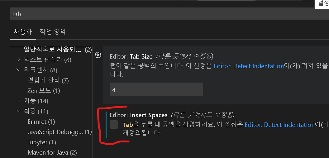 Tab키로 인한 자동 Spaces삽입 끄기