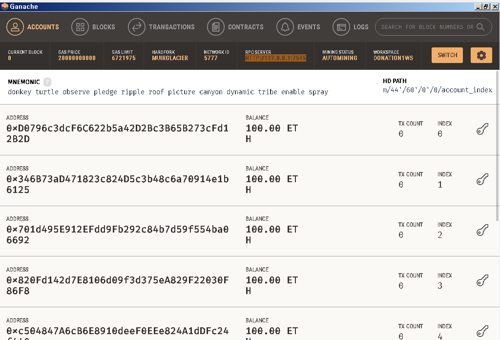 Ganache에 연결되고 MNEMONIC을 등록해서 새로운 계정들이 등록 됨