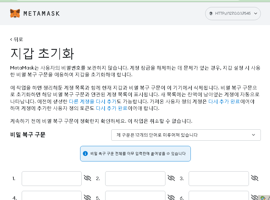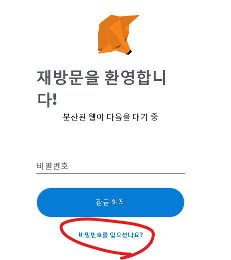 MetaMask는 사용자의 비밀번호를 보관하지 않습니다. 계정 잠금을 해제하는 데 문제가 있는 경우, 지갑 설정 시 사용한 비밀 복구 구문을 이용하여 지갑을 초기화해야 합니다.