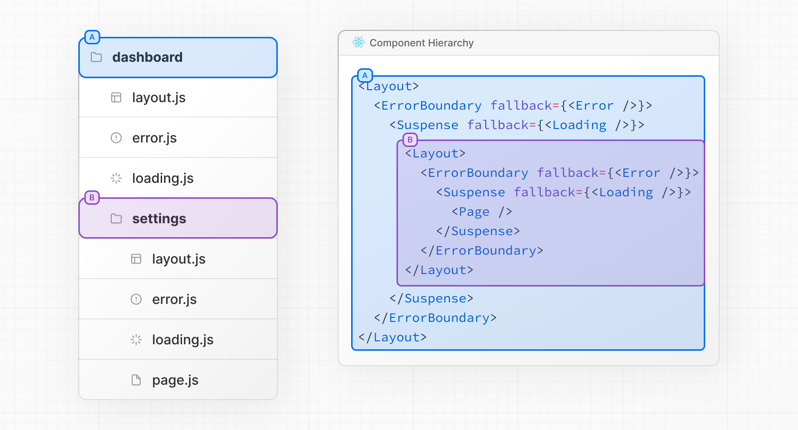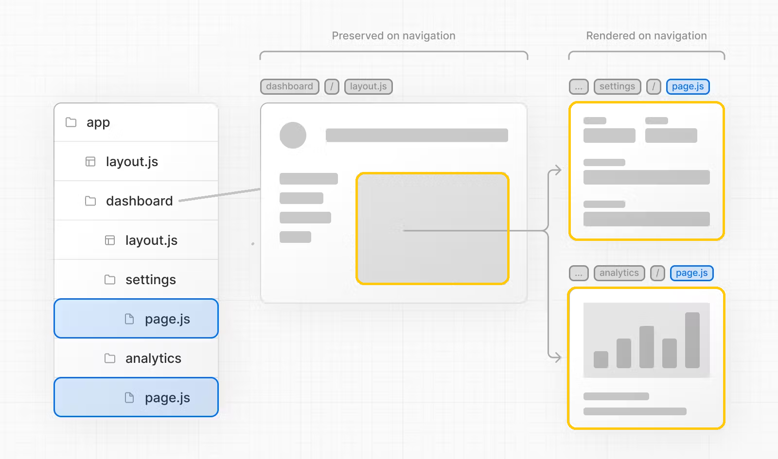 형제 경로(예 /dashboard/settings: /dashboard/analytics이하) 사이를 탐색할 때 Next.js는 변경되는 경로의 레이아웃과 페이지만 가져오고 렌더링합니다. 하위 트리의 세그먼트 위에 있는 항목을 다시 가져오거나 다시 렌더링 하지 않습니다 . 이는 레이아웃을 공유하는 경로에서 사용자가 형제 페이지 사이를 탐색할 때 레이아웃이 유지됨을 의미합니다.