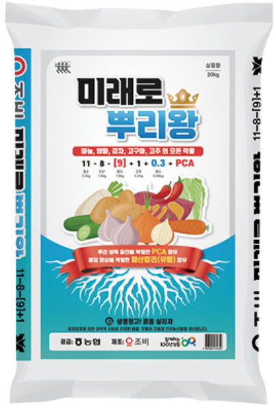 ‘미래로뿌리왕’은 질소와 인산, 칼리가 모두 한 개의 입자에 조립된 단립자 비료로 작물에 비료 성분을 균일하게 공급해준다. 기능성 성분인 PCA는 생분해성 및 수용해성이 높은 특수 고분자 유기산이다. 뿌리 발근을 좋게 해 양분 흡수율 증대에 도움을 준다. 수분 보습 기능도 있어서 수분 부족으로 인해 생기는 작물의 수분스트레스를 경감시켜 준다.