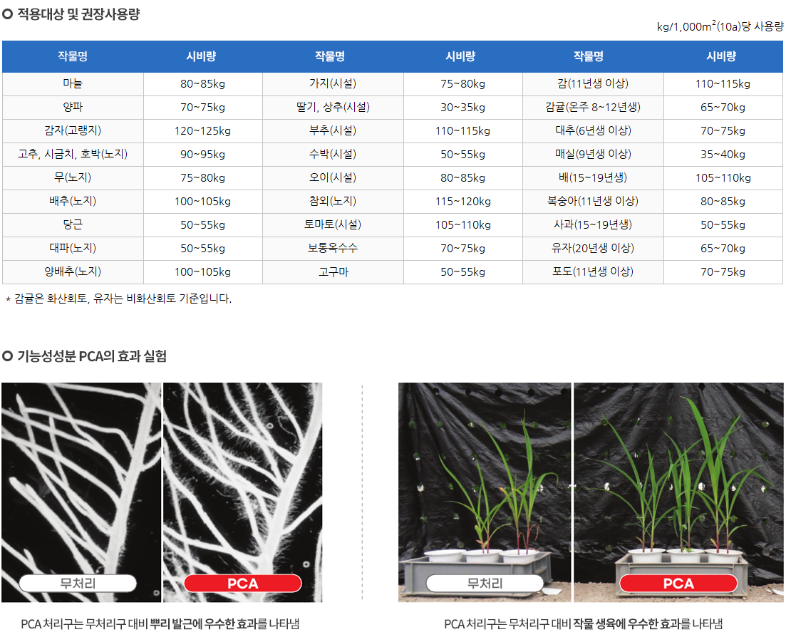 필수 3요소 외에 다량요소인 고토와 미량요소인 붕소가 함유돼 작물의 잎과 줄기의 생장에 도움을 준다. 작물을 튼튼하게 해 냉해 및 동해, 병충해에 대한 저항성도 높여준다. 특히 고함량의 붕소는 암모니아태 질소, 칼리, 칼슘의 흡수를 돕고 세포 분열과 화분 수정을 촉진한다.제품소개