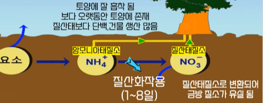 토양 미생물에 의하여 1~8일이 지나면 질산화작용으로 '질산태질소(NO3-)'로 변환된다.