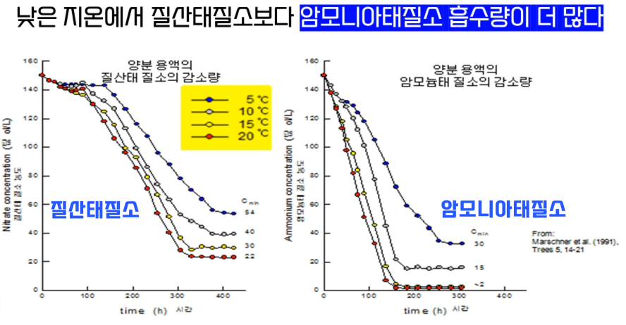 '미생물 질산화작용': '암모늄태질소(NH4+)'에서 1~7일이 지나면 질산화작용으로 '질산태질소(NO3-)'로 변환된다.