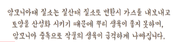 '요소(질소) 휘산': 요소태 질소는 암모니아태 질소로 변화하는 과정에서 많은 질소가스를 방출. 암모니아태 질소는 질산태 질소가 되기 전 염기성 물질을 만나게 되면 질소가스를 방출.