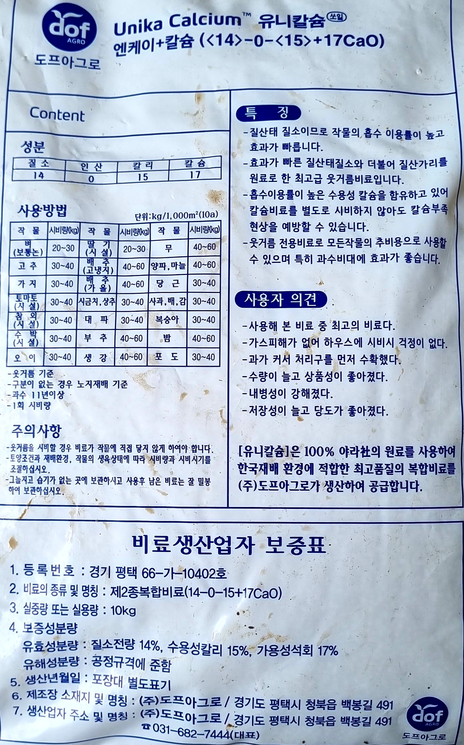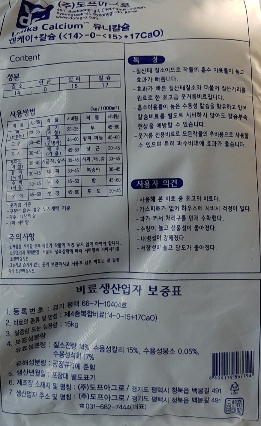 질소전량 14%, 수용성칼리 15%, 수용성붕소 0.05%, 수용성석회 17%