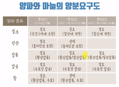 시간별 필요 양분 종류와 양 고려: '마늘 양파의 잎과 구 양분 흡수량 (Yara)'