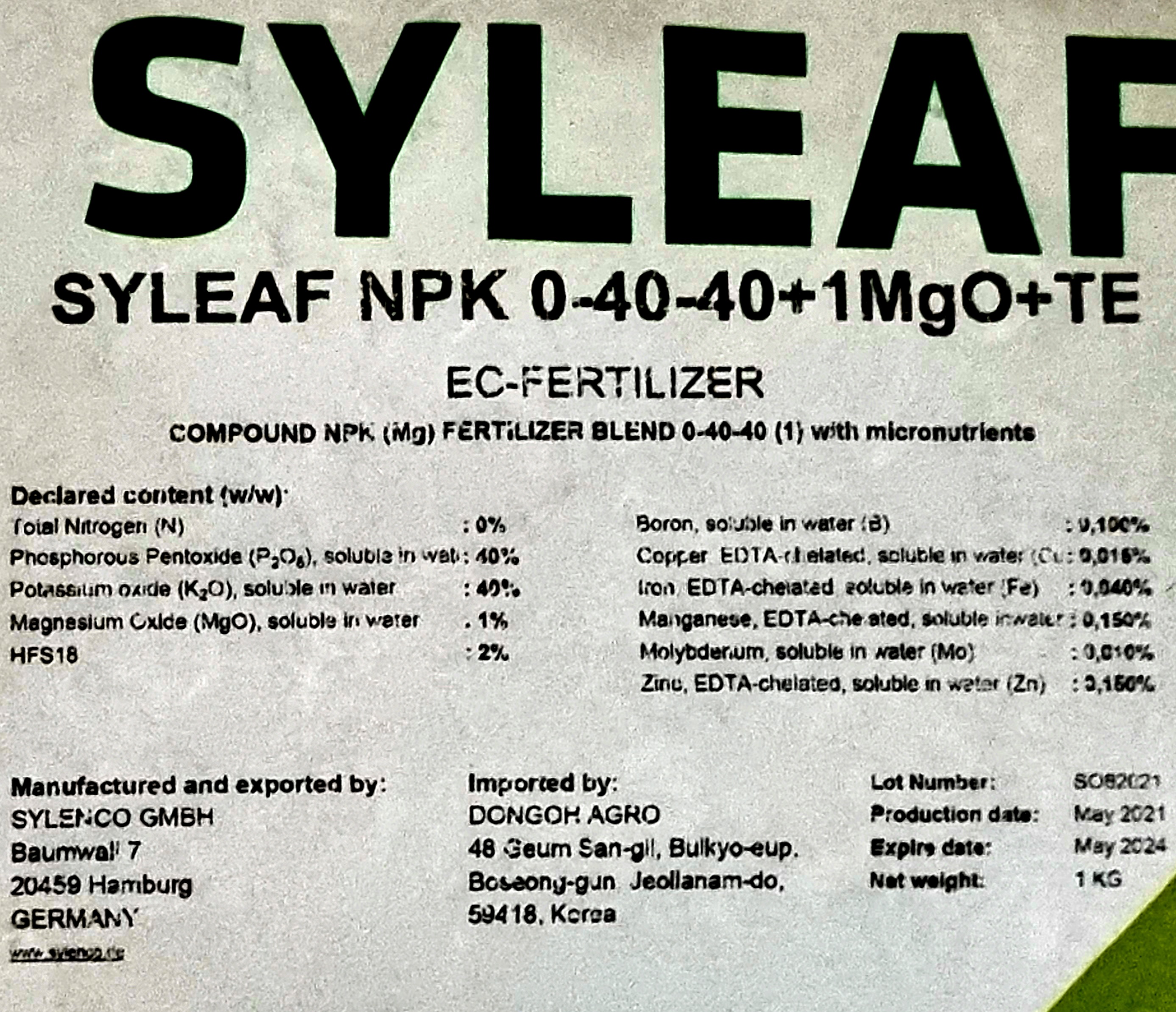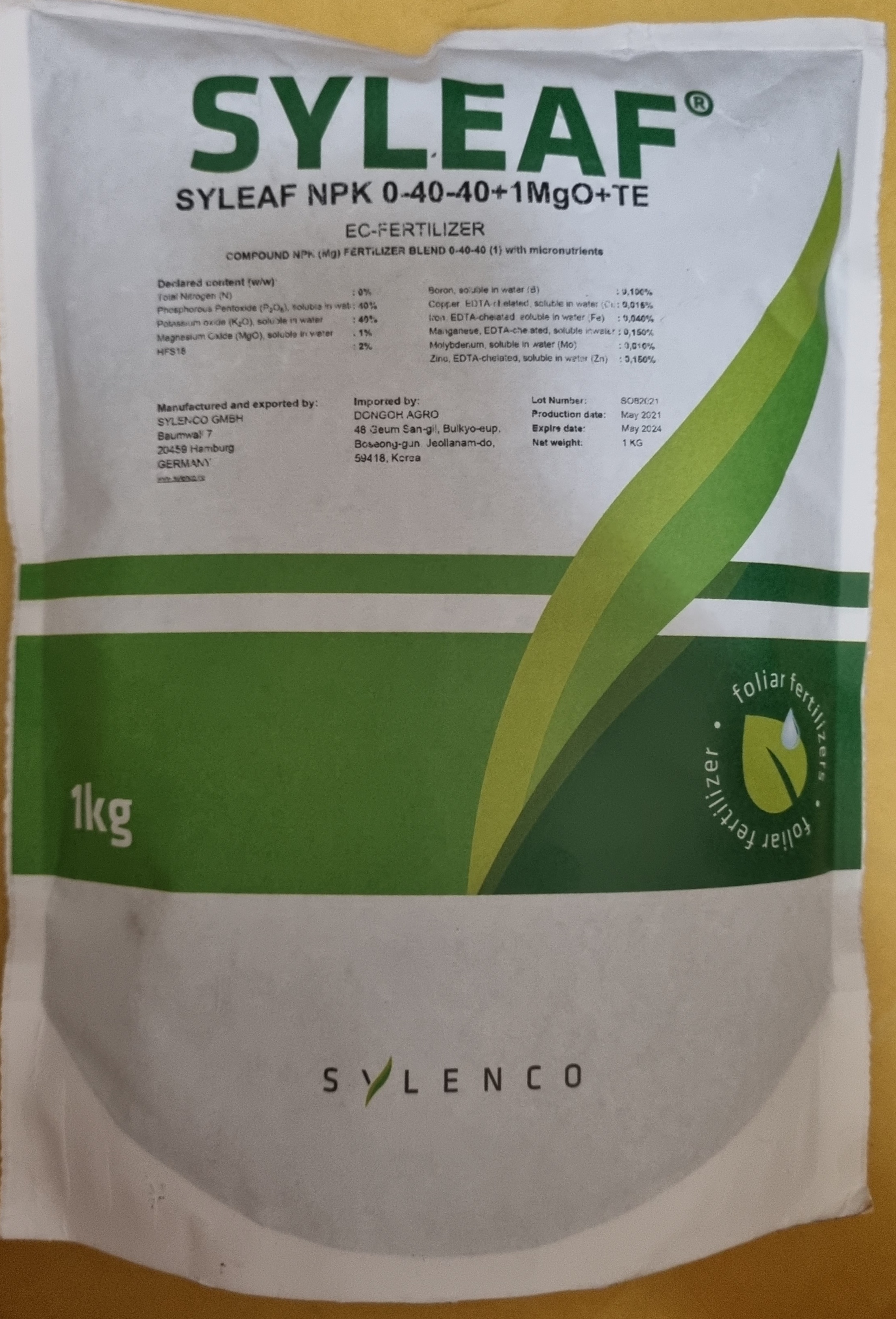 – 작물이 최적의 생산을 달성하는 데 방해가 될 수 있는 많은 생리적 장애를 방지하기 위해 EDTA로 킬레이트된 미량 영양소 함량이 매우 높다.Syleaf 0-40-40 + 1 MgO + TE
