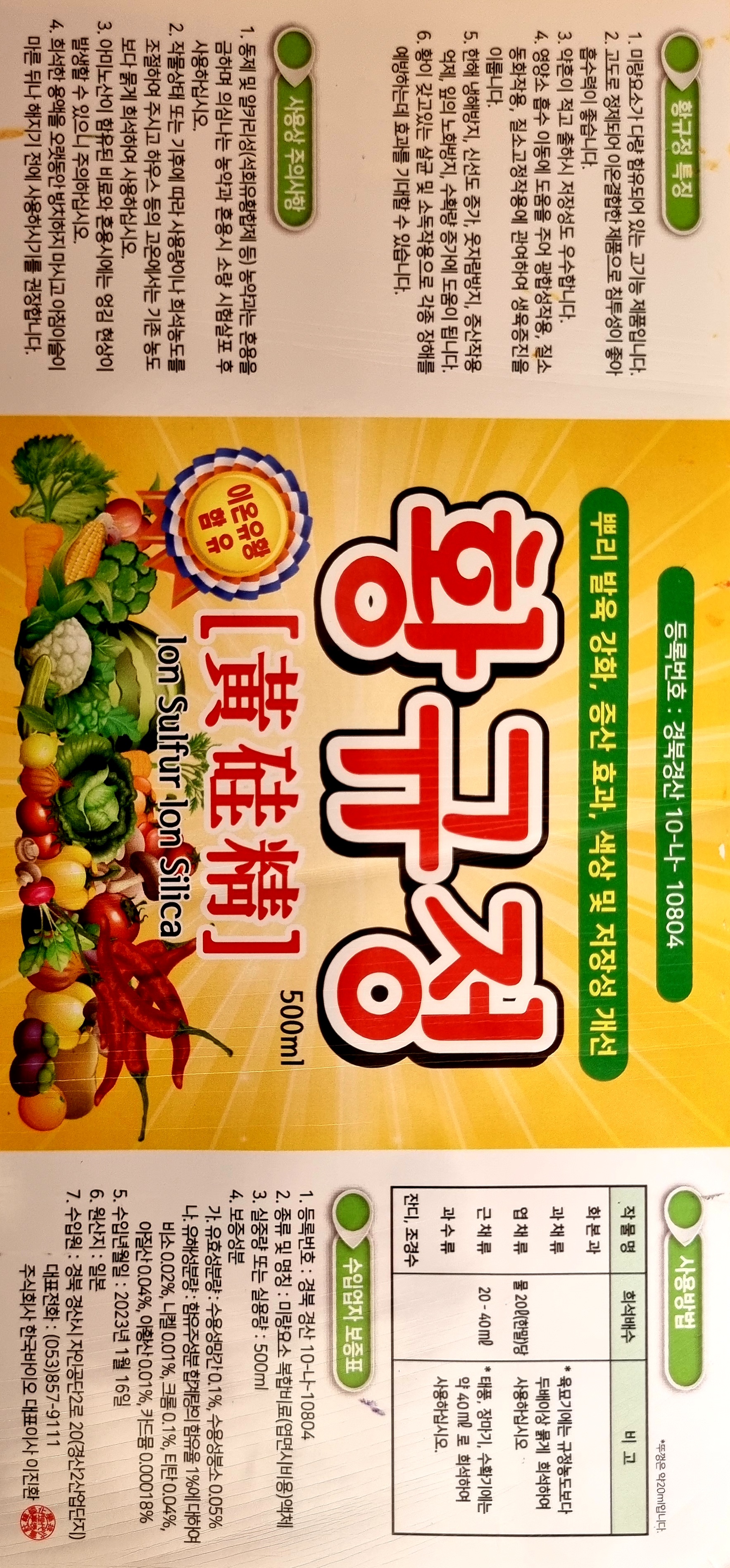 수용성망간 0.1%, 수용성붕소 0.05%,함유주성분합계량ㅇ의함유율 1%대하여 비소 0.02 니켈 0.01 크롬 0.1 티탄 0.04 아질산 0.04 아황산 0.01 카드뮴 0.00018