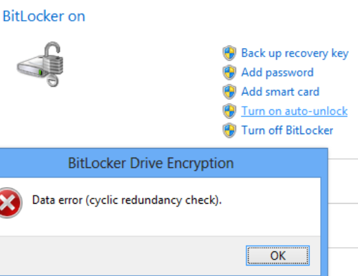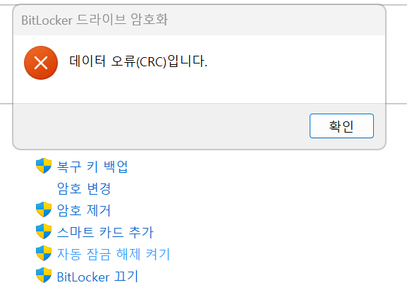 자동 잠금 해제 활성화 시, CRC 오류라며 진행이 안되는 경우.
