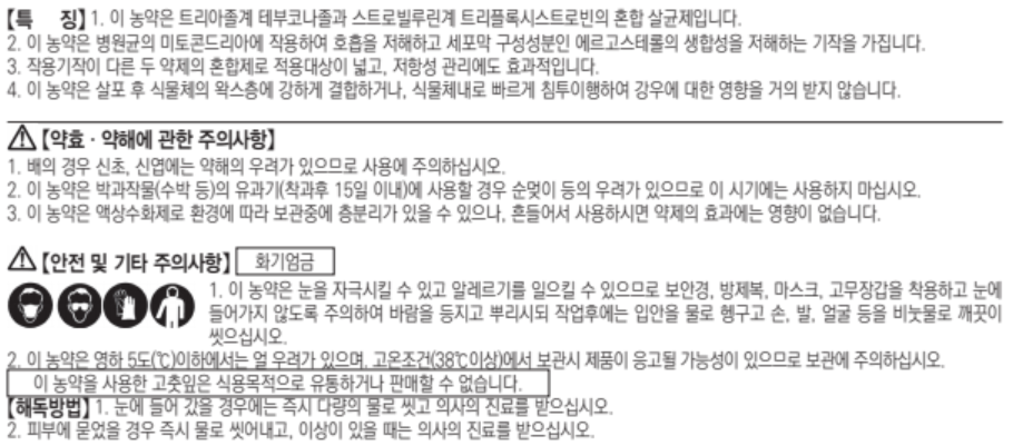 살포 후 식물체 표면의 왁스층에 강하게 결합하거나 작물체내로 신속히 침투이행하므로 강우에 의한 영향이 거의 없습니다.