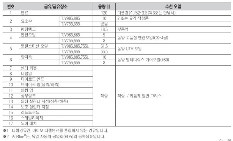 엔진에는 CK-4를 사용하지만, 미션에는 UTH(GL-4수준)를 사용.