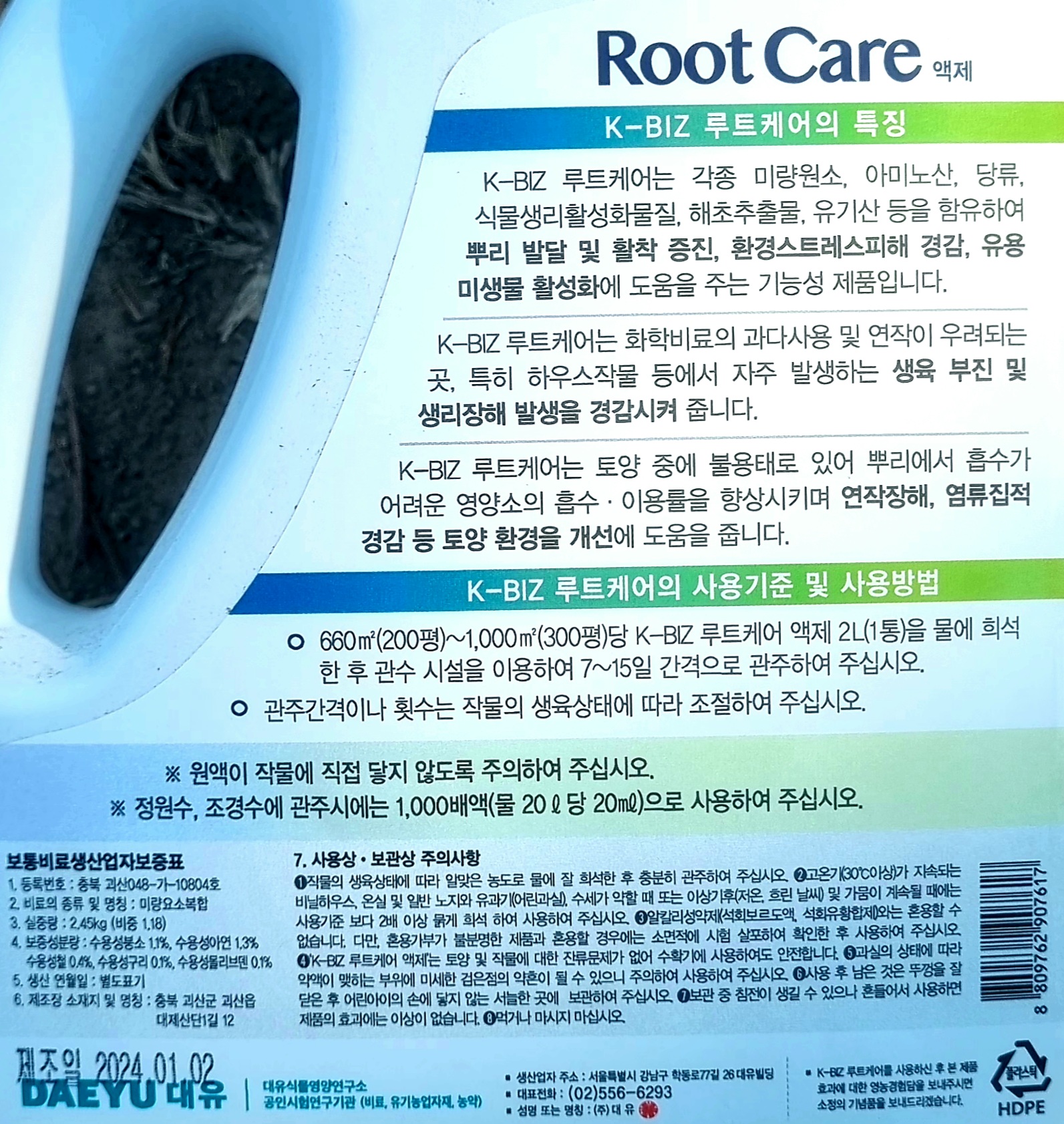 루트 케어액제 K-BIZ 루트케어의 특징 K-BIZ 루트케어는 각종 미량원소, 아미노산, 당류, 식물생리활성화물질, 해초추출물, 유기산 등을 함유하여 뿌리 발달 및 활착 증진, 환경스트레스피해 경감, 유용 미생물 활성화에 도움을 주는 기능성 제품입니다. K-BIZ 루트케어는 화학비료의 과다사용 및 연작이 우려되는 곳, 특히 하우스작물 등에서 자주 발생하는 생육 부진 및 생리장해 발생을 경감시켜 줍니다. K-BIZ 루트케어는 토양 중에 불용태로 있어 뿌리에서 흡수가 어려운 영양소의 흡수·이용률을 향상시키며 연작장해, 염류집적 경감 등 토양 환경을 개선에 도움을 줍니다. K-BIZ 루트케어의 사용기준 및 사용방법 ○ 660㎡(200평)~1,000㎡(300평)당 K-BIZ 루트케어 액제 2L(1통)을 물에 희석 한 후 관수 시설을 이용하여 7~15일 간격으로 관주하여 주십시오. ○ 관주간격이나 횟수는 작물의 생육상태에 따라 조절하여 주십시오.