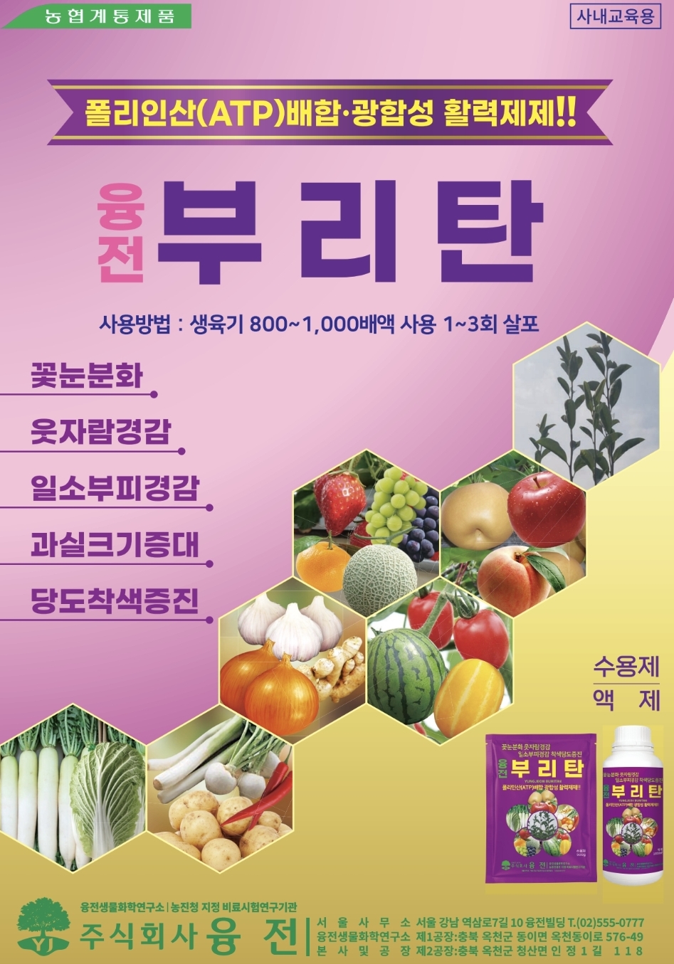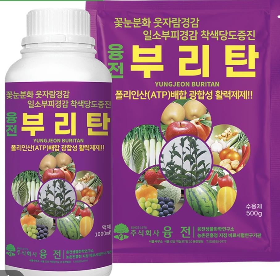 융전 부리탄은 생식생장에 필요한 필수 영양성분을 흡수가 용이하도록 균형있게 제조한 생리활성 식물영양제. ·융전 부리탄은 광합성을 증대시켜 도장억제, 화아분화 촉진, 과실크기 증대, 착색·당도 증진효과에 도움. ·융전 부리탄은 작물의 에너지원인 고함량의 폴리인산·유기가리 20여종 동물성 유리아미노산과 대사 활동을 통해 고품질 농산물 수확량 증대에 기여. ·융전 부리탄은 환경장해에 대한 저항력 증대와 특히 폭염 일소피해 경감, 감귤 부피과 발생 경감에 효과적인 제품.