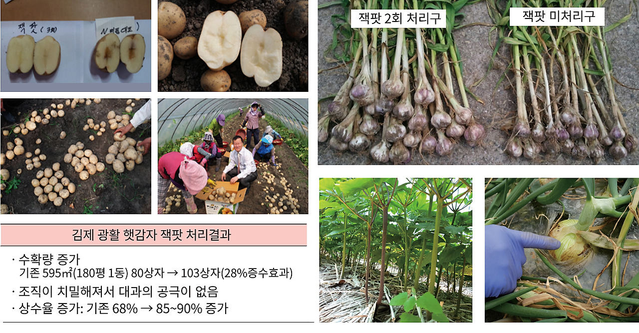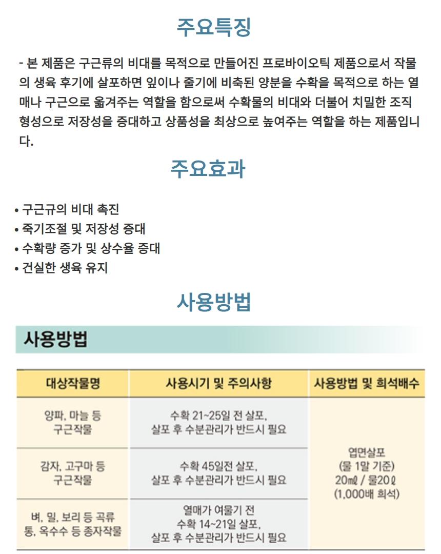 본 제품은 구근류의 비대를 목적으로 만들어진 프로바이오틱 제품으로서 작물의 생육 후기에 살포하면 잎이나 줄기에 비축된 양분을 수확을 목적으로 하는 열매나 구근으로 옯겨주는 역할을 함으로써 수확물의 비대와 더불어 치밀한 조직형성으로 저장성을 증대하고 상품성을 최상으로 높여주는 역할을 하는 제품입니다.
